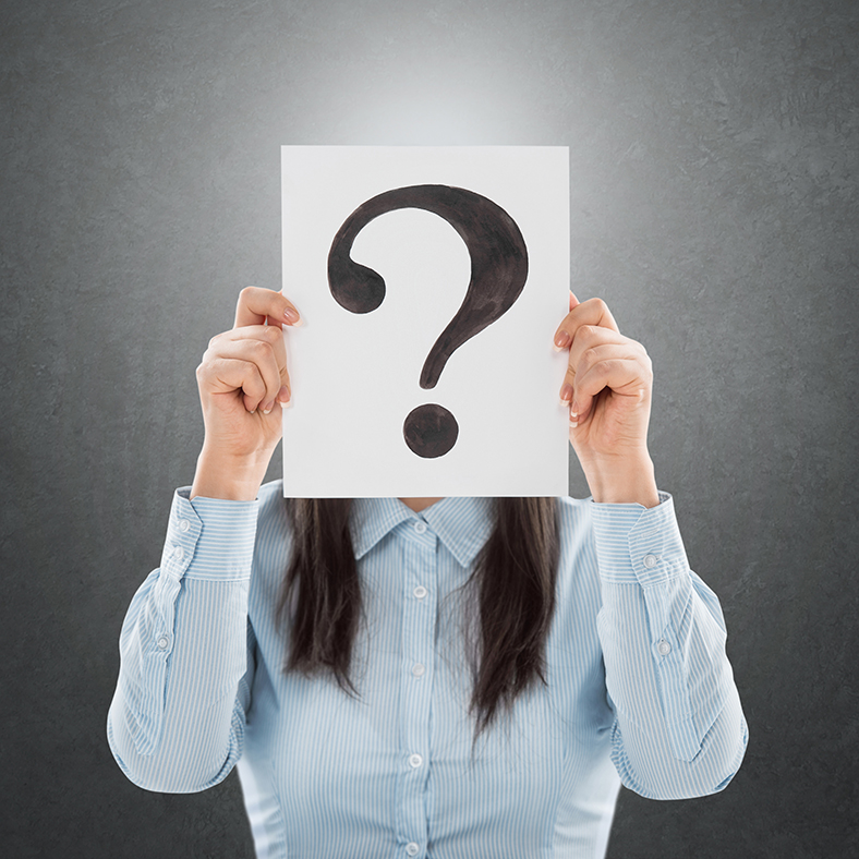 Simple, right?Young woman holding interrogation symbol in front of her face